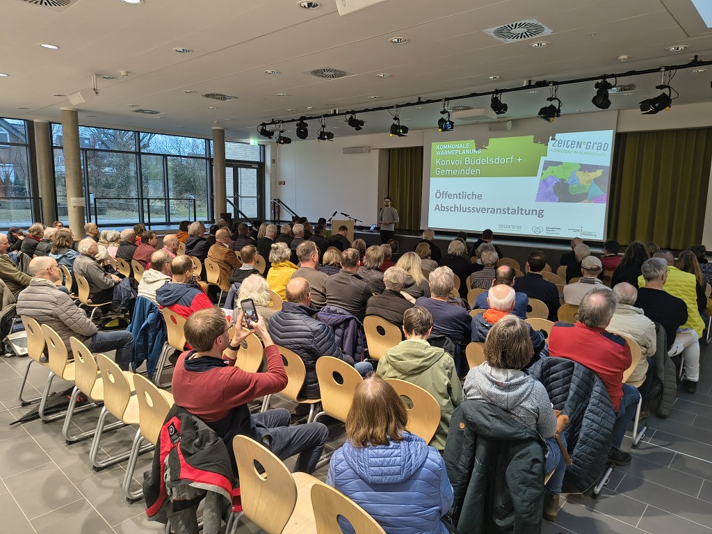 Vor 80 Gästen wurden am Dienstagabend, den 24. März 2026 in Büdelsdorf die Ergebnisse der kommunalen Wärmeplanung vorgestellt, erarbeitet vom Ingenieurbüro Zeiten°Grad, unterstützt von der Klimaschutzagentur und der Entwicklungsagentur für den Lebens- und Wirtschaftsraum Rendsburg.