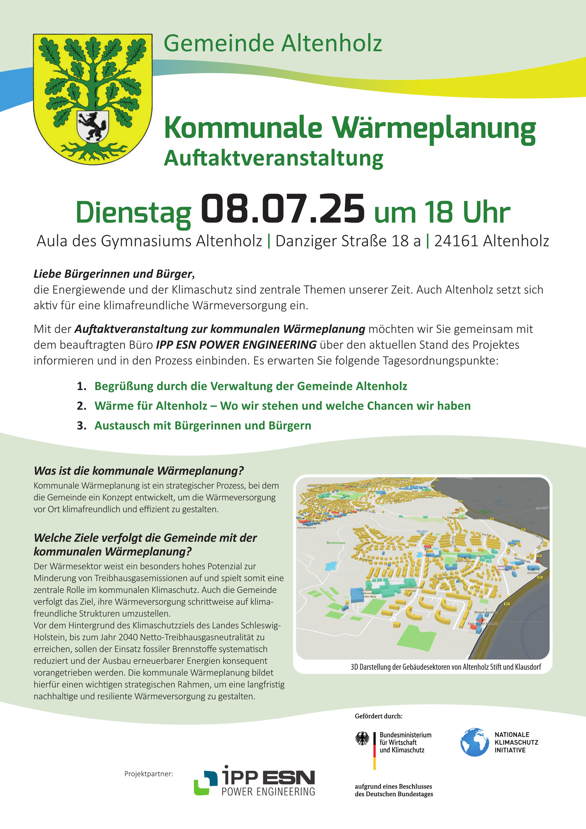 Mit der Auftaktveranstaltung zur kommunalen Wärmeplanung möchten die Gemeinde Altenholz gemeinsam mit dem beauftragten Büro IPP ESN POWER ENGINEERING Bürgerinnen und Bürger über den aktuellen Stand des Projektes informieren und in den Prozess einbinden.