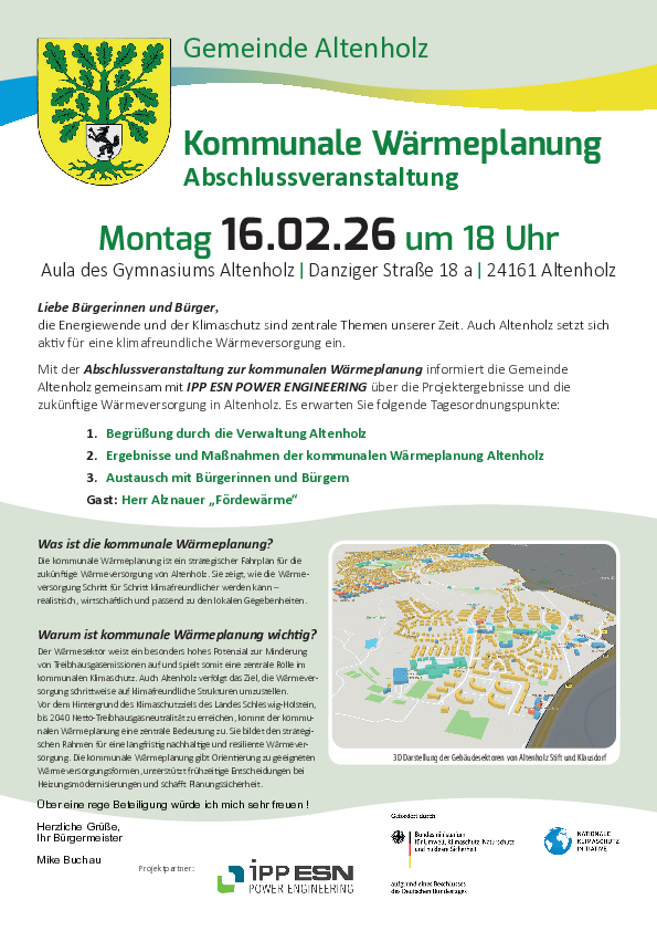 Die Gemeinde Altenholz lädt Sie herzlich zur Abschlussveranstaltung zur Kommunalen Wärmeplanung am 16.Februar 2026 ein.